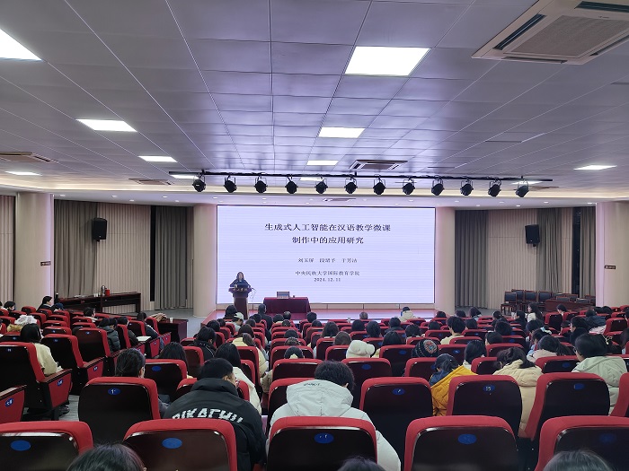 12月12日晚,中央民族大学大学刘云屏教授应邀来我校作了题为《生成式人工智能在汉语教学微课制作中的应用研究》的学术报告。报告在文端楼二楼报告厅举行,全校新进博士、太阳集团tyc151cc师生近200人参加活动,太阳集团tyc151cc院长沈昌明主持报告会。