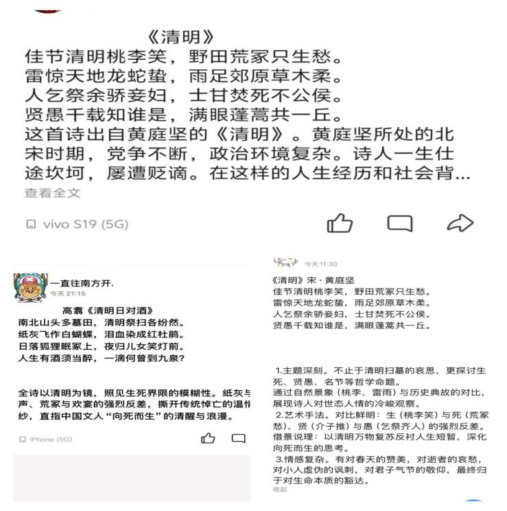 清明兼具自然与人文双重意蕴,自古便是文人墨客的创作源泉。活动中,参与者们围绕杜牧《清明》、黄庭坚《清明》等经典诗作展开深入解读,剖析诗词中蕴含的慎终追远之情与生命哲思。通过线上分享,参与者不仅梳理了清明诗词的发展脉络,还尝试创作个人诗作,将传统意境与现代感悟相融合,体悟“清明”文化的深厚底蕴。