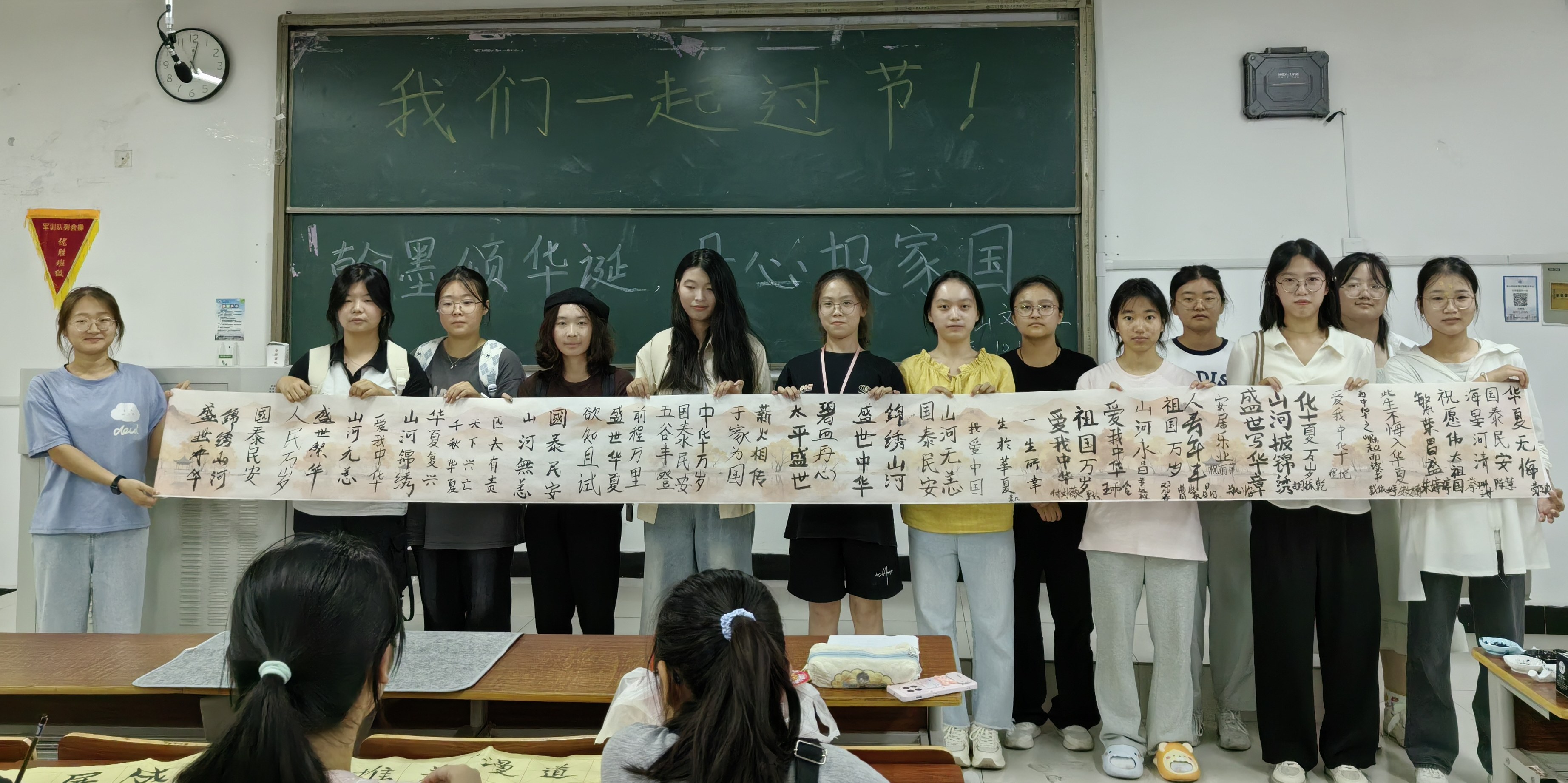 现场铺设的十米书法长卷成为活动的另一大亮点。同学们纷纷挥毫泼墨,共同书写深情寄语与爱国关键词,汇聚成一幅象征团结与奋进的壮丽画卷。这一环节极大地提升了本次活动的互动性与参与感,使每位同学都深刻感受到集体的凝聚力和对祖国的深厚热爱。