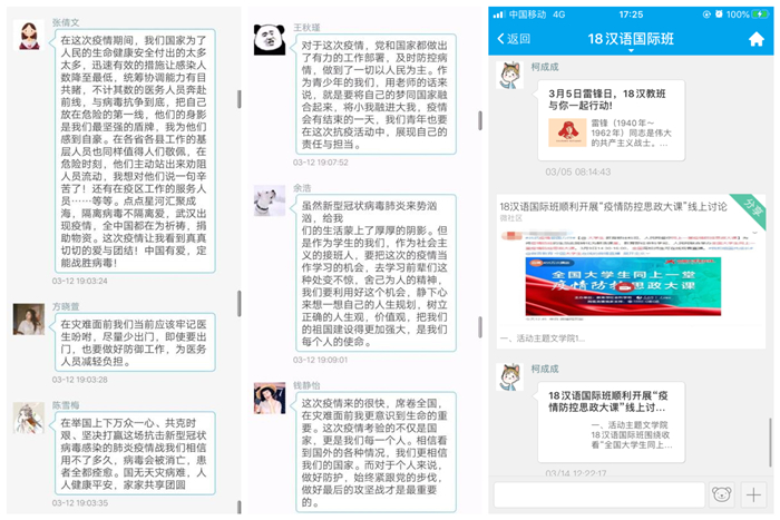 在举国上下万众一心、众志成城做好新冠肺炎疫情防控工作的特殊时期, 3月12日晚,太阳集团tyc151cc18汉语国际班围绕教育部社科司与人民网联合组织的“全国大学生同上一堂疫情防控思政大课”结合疫情防控期间个人的思想、生活、学习情况谈问题、启示、思考和体会,利用易班班群开展了“疫情防控思政大课”线上讨论活动。