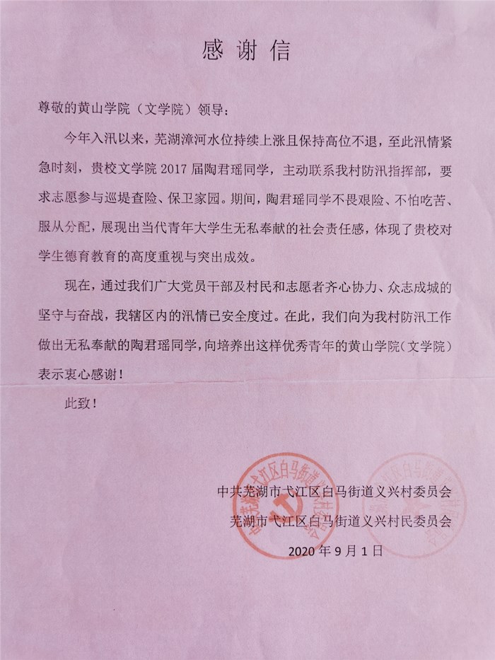 近日,太阳集团tyc151cc收到芜湖市弋江区白马街道义兴村民委员会的感谢信,对该院17级汉语言文学专业2班陶君瑶同学志愿参与该村抗洪抢险、保卫家园的行为表示感谢。