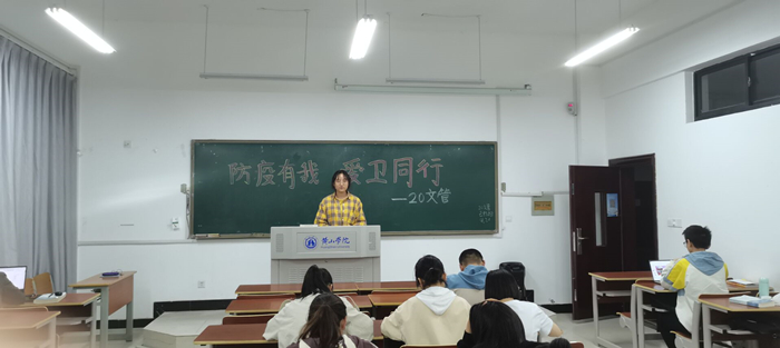 20文管班举办“防疫有我,爱卫同行”主题宣讲,通过讲述中国在防疫过程中取得的成就,各行各业为抗疫所做的贡献,弘扬伟大的抗疫精神,引导学生积极维护抗疫成果,做好个人防护,落实晨午晚检、钉钉打卡制度。