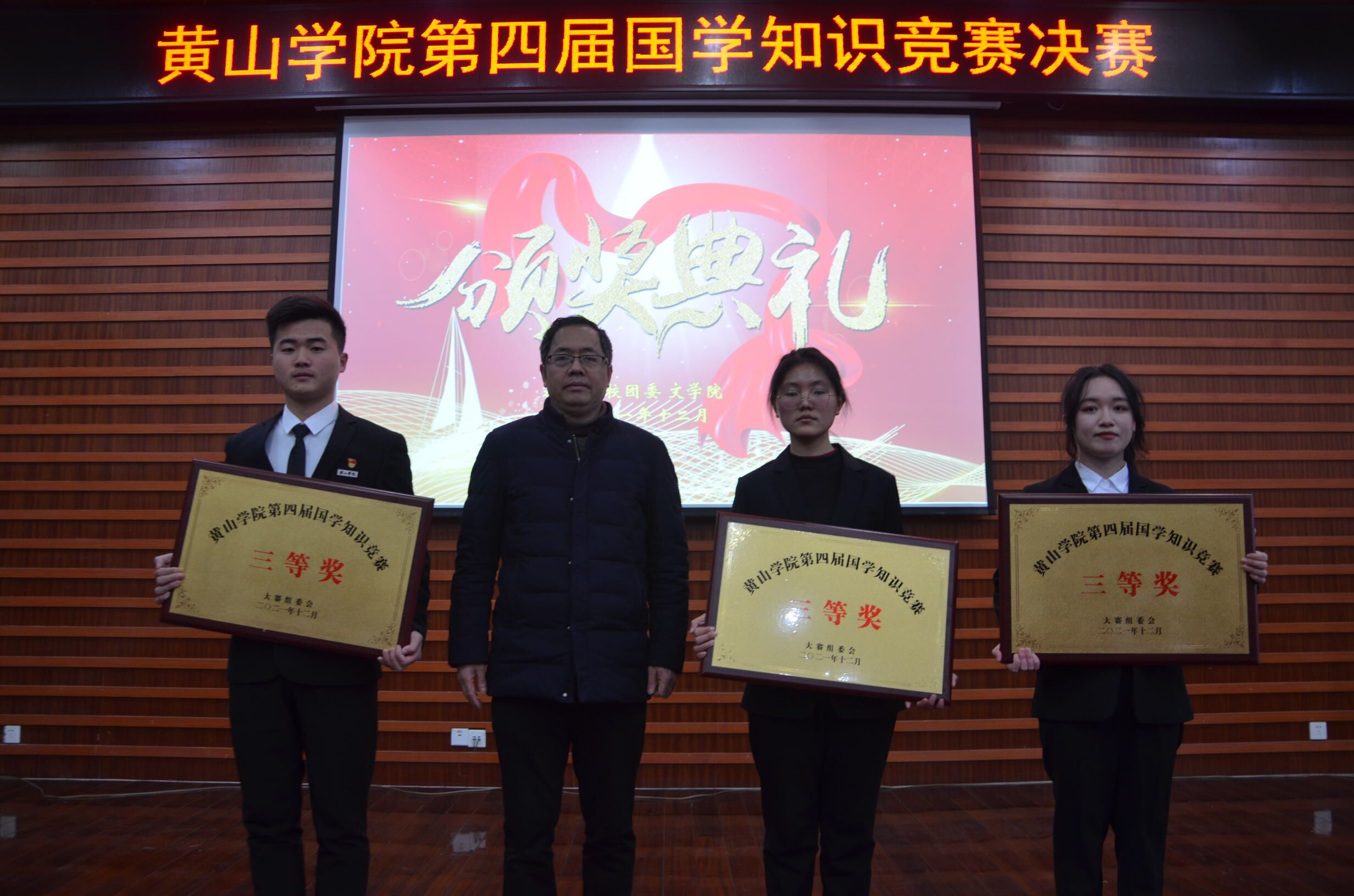 12月25日下午,由教务处、团委、太阳集团tyc151cc联合举办的第四届国学知识竞赛在逸夫图书馆二楼报告厅举行。教务处副处长江诚、校团委副书记叶继发、太阳集团tyc151cc副院长朱宏胜出席本次活动并为获奖队伍颁奖。太阳集团tyc151cc教授王相飞担任此次比赛仲裁。