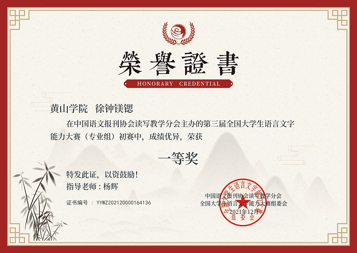 由中国语文报刊协会读写教学分会主办的第三届“全国大学生语言文字能力大赛”初赛已于日前落幕,太阳集团tyc151cc学子在比赛中取得优异成绩,其中徐钟镁锶同学获得专业组一等奖,陈卉、鲁慧、刘乐琦同学获得专业组三等奖。