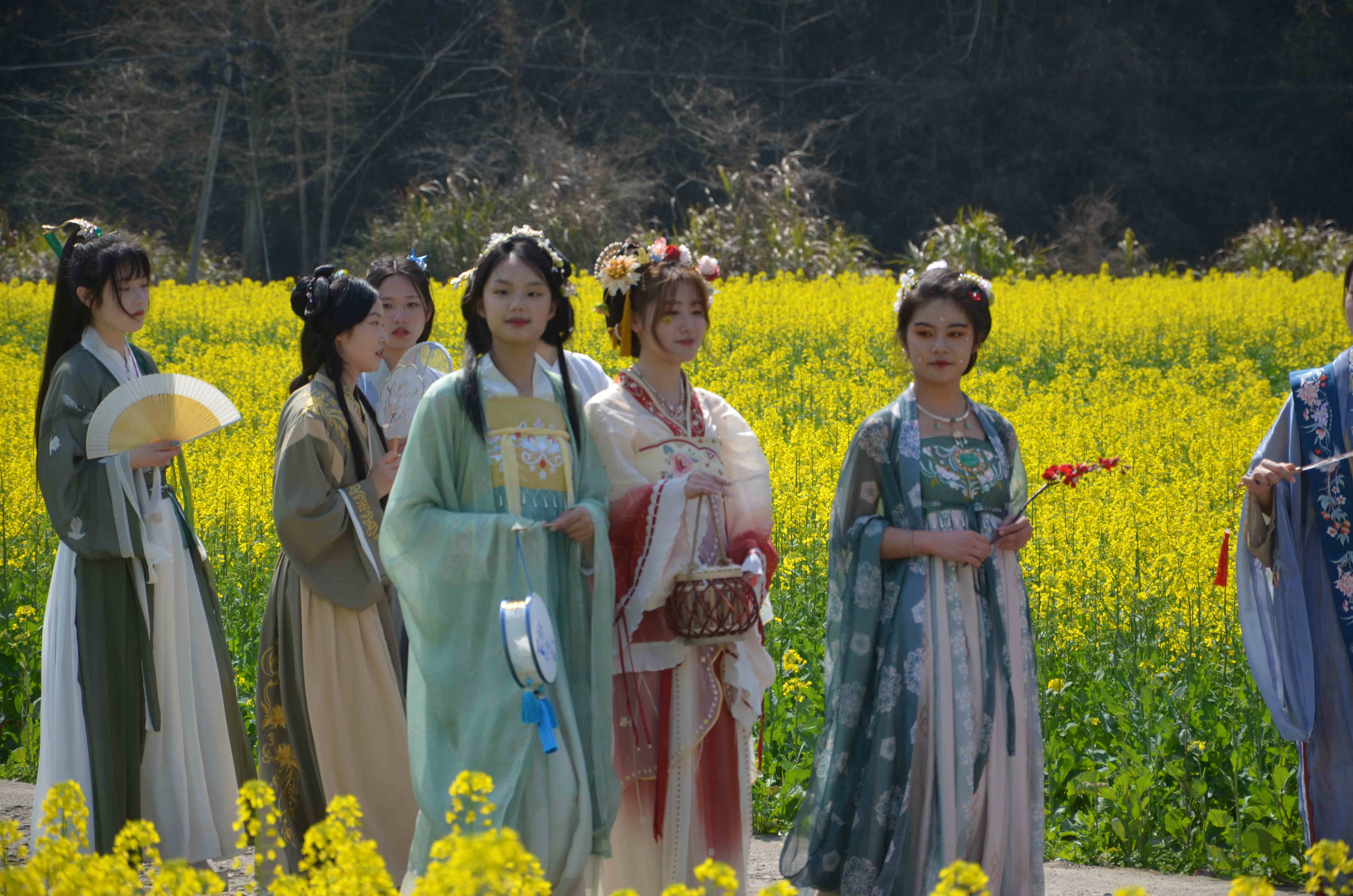 表演结束后,大家在春意盎然的油菜花田进行汉服游园,形成一道靓丽的风景线。