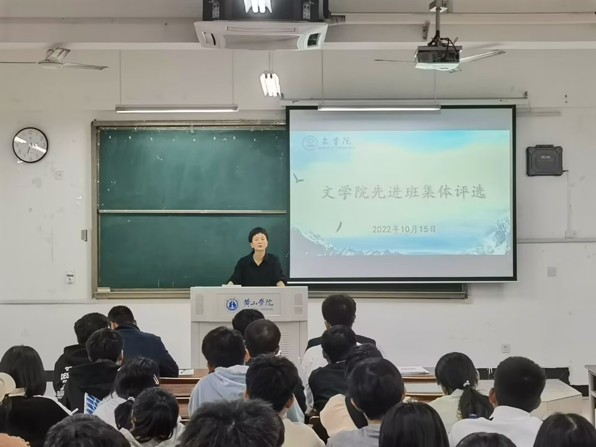 活动开始,21中文2班、21汉教班、20中文2班、20文管班、20汉教班班级代表按抽签顺序依次上场,通过PPT展示各班基本状况、团支部建设、活动开展、学风建设、卫生和心理安全教育情况,并汇报了班级成员学科竞赛和体育赛事的获奖情况。党总支副书记周志荣老师在汇报结束后作总结点评,要求全体学生干部牢记职责使命,做肯吃苦敢担当的新时代青年。