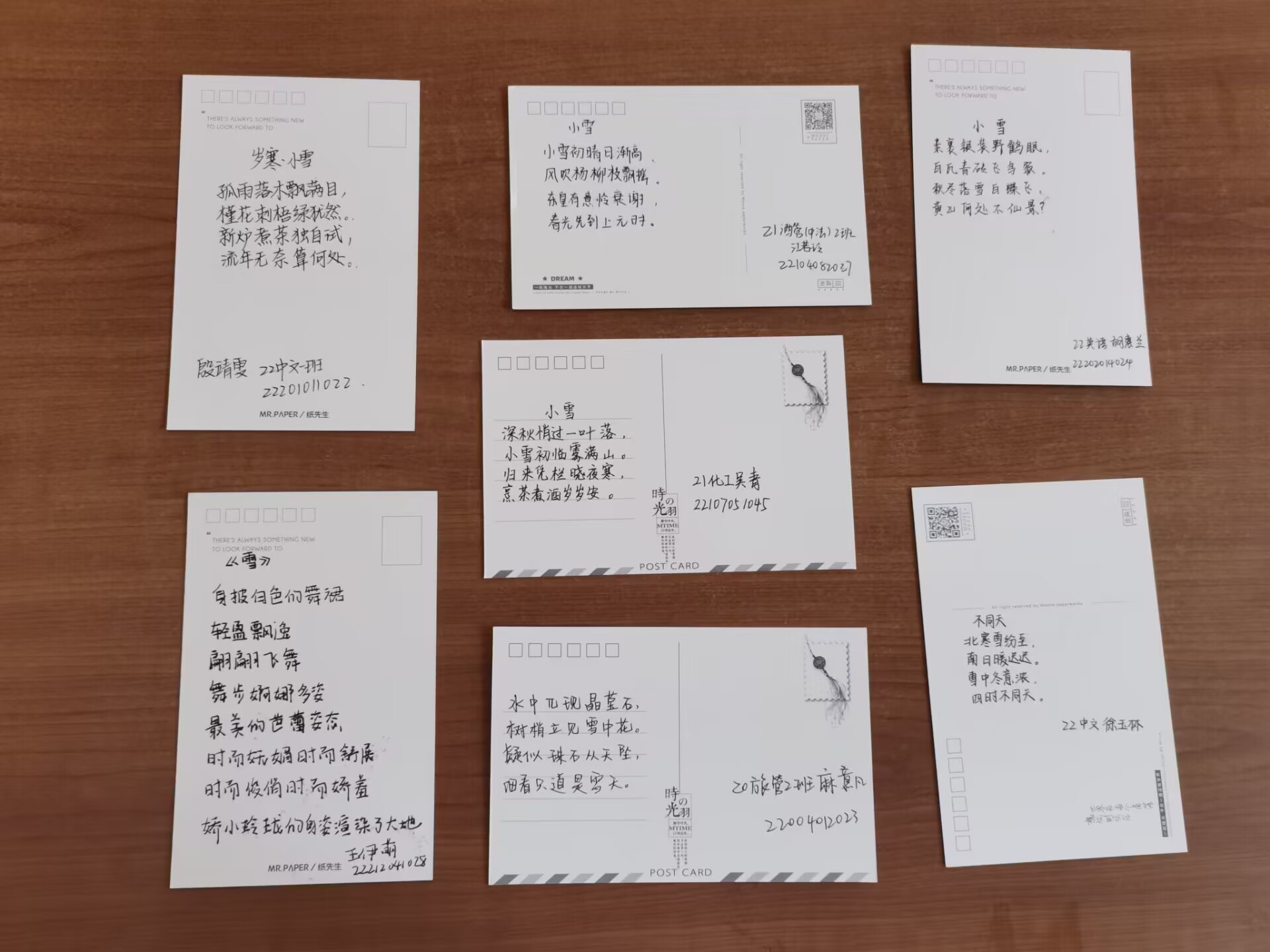 活动期间,同学们踊跃报名。参与同学在活动规定时间内到达活动地点完成诗词创作,并写在工作人员提供的书签上。同学们提交的作品内容丰富,语言优美,文笔流畅,展现了其深厚的文化功底。
