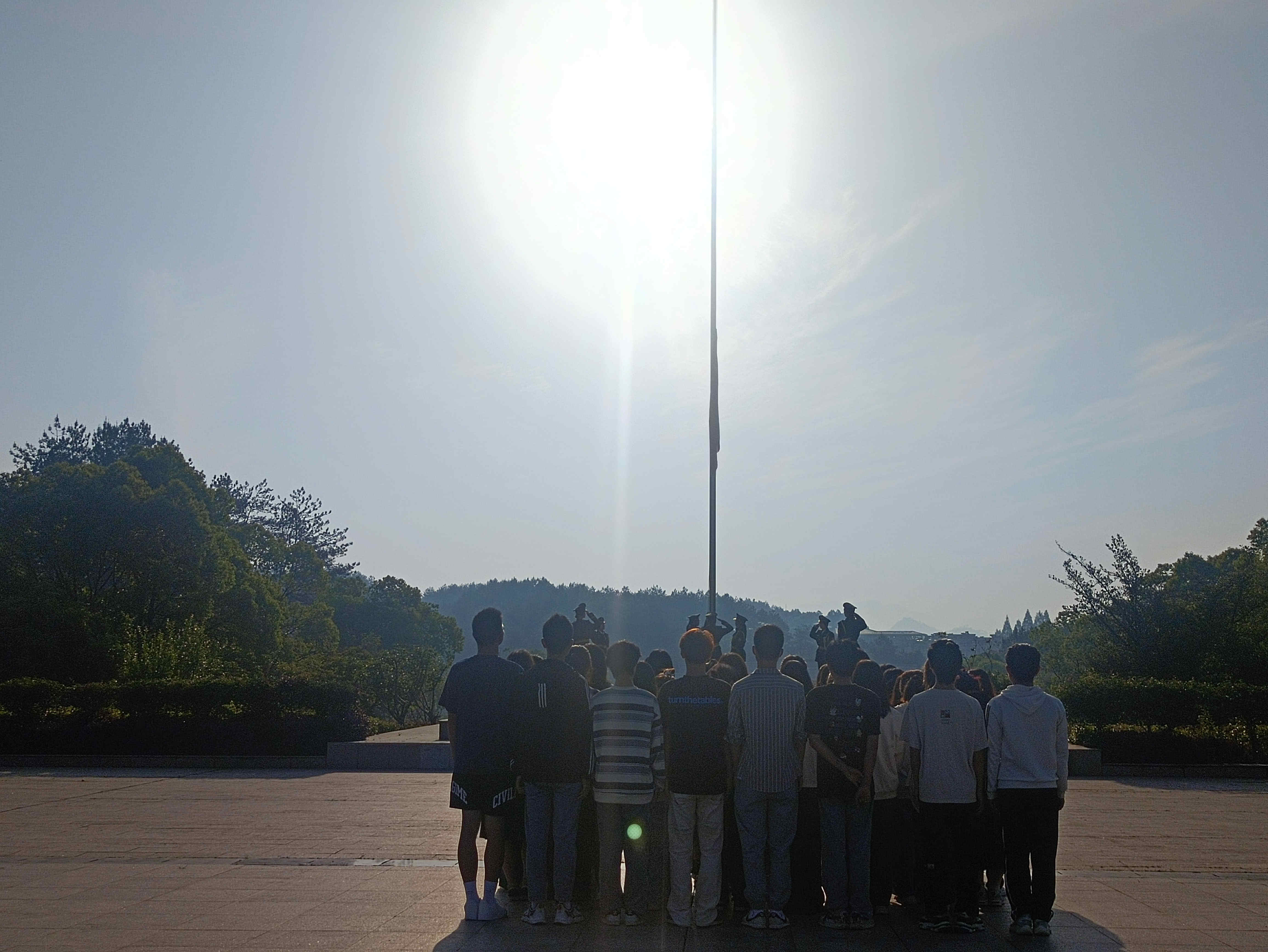 7时整,国旗护卫队队员迈着矫健的步伐,护送国旗走向升旗台,在全体师生的注视下,鲜艳的五星红旗迎着晨曦冉冉升起,全体师生一起高唱国歌,庄严肃穆、心潮澎湃,心怀对祖国的崇敬与热爱,共同感受这庄严的一刻。