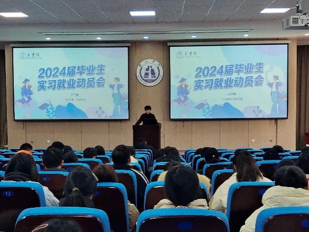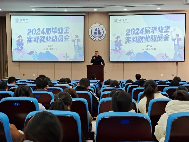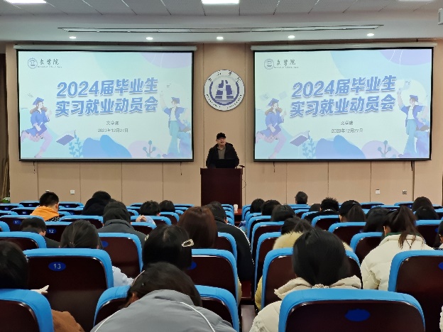 12月27日下午,太阳集团tyc151cc2024届毕业生实习就业动员暨宣讲会在文端楼一楼报告厅举行,该院党政领导班子成员、毕业班辅导员、就业单位代表及2024届全体学生参加了会议,会议由该院党总支副书记周志荣主持。