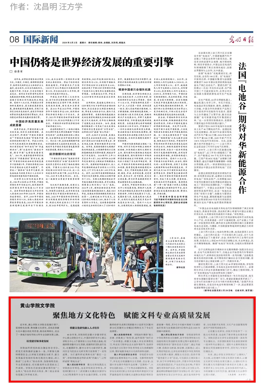 2024年3月2日,《光明日报》08版国际新闻以《聚焦地方文化特色 赋能文科专业高质量发展》为题,从“以党建引领事业发展”、“将徽文化研究融入人才培养”等方面,报道我院特色办学成果。