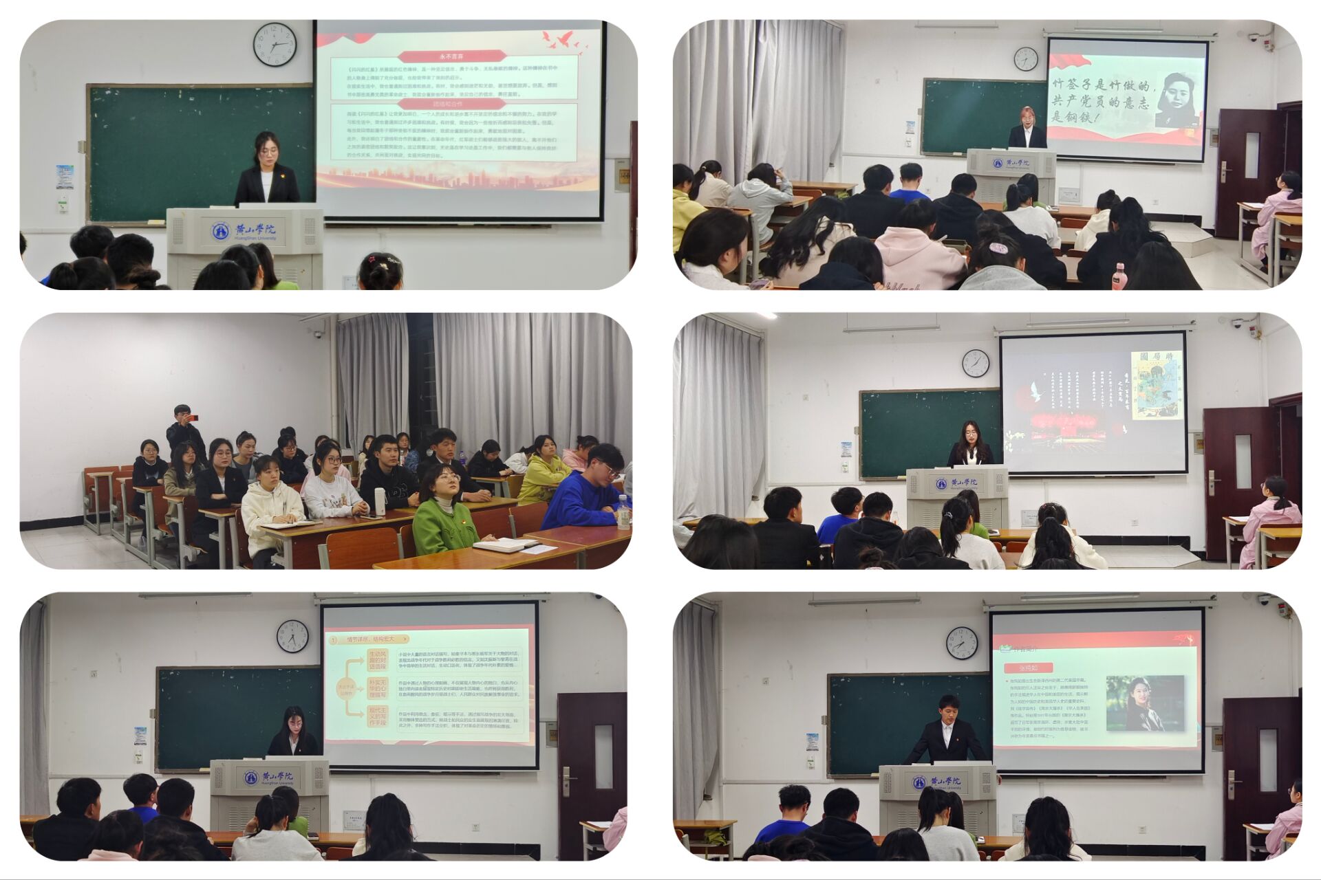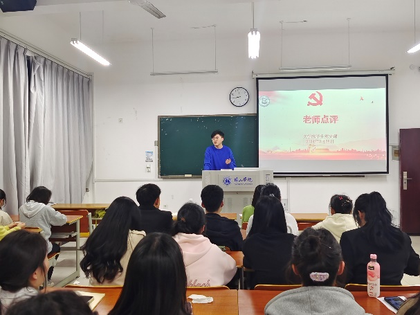 线下活动由王琼老师主持。学生党员和积极分子代表手持红色经典书籍,深情分享了自己的阅读感悟。“红星闪闪放光彩,红星灿灿暖胸怀”,王烁同学分享的《闪闪的红星》,讲述了潘冬子用智慧与勇气来投身革命的“追光”之旅,告诉我们要为理想而奋斗,不怕困难,始终保持信念和坚持。孔滢同学带来《红日》,该书讲述故事以军长沈振新、政委丁元善所率领的一支部队为主线,环绕着山东战场上著名的莱芜、孟良崮两大战役,描绘了波澜壮阔的战斗场面和可歌可泣的英勇事迹,警醒我们美好生活是革命先烈用鲜血换来的,和平来之不易,要珍惜当下。卞杰同学阅读的《南京大屠杀》是一部血与火的历史,它真实揭露了日本侵略者的暴行,提醒我们铭记历史,知耻而后勇。此外,入党积极分子娄明秋、殷伊璇同学分别讲述的是《为什么是中国》和《红岩》,让在场的师生对党的历史和红岩精神有了更加清晰的认识。
