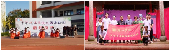 与屯溪区江南实验小学、休宁中学等单位合作,开展中华优秀传统文化 进校园活动,产生了良好社会反响。学院秉持学校地方性应用型的办学定位,积极开展校地合作。先后与黄山市文投公司、歙县牌坊群鲍家花园开发有限 公司、祁门县文旅局等单位签订合作协议,就目连戏保护传承、文化资源开 发利用、文化产业创意策划等进行产学研用深度合作。期间给地方企事业单 位提供业务培训300余次,为地方单位提供科研服务30人次;参与地方村 志研究撰写3人次,其中《许村志》获省社科三等奖。