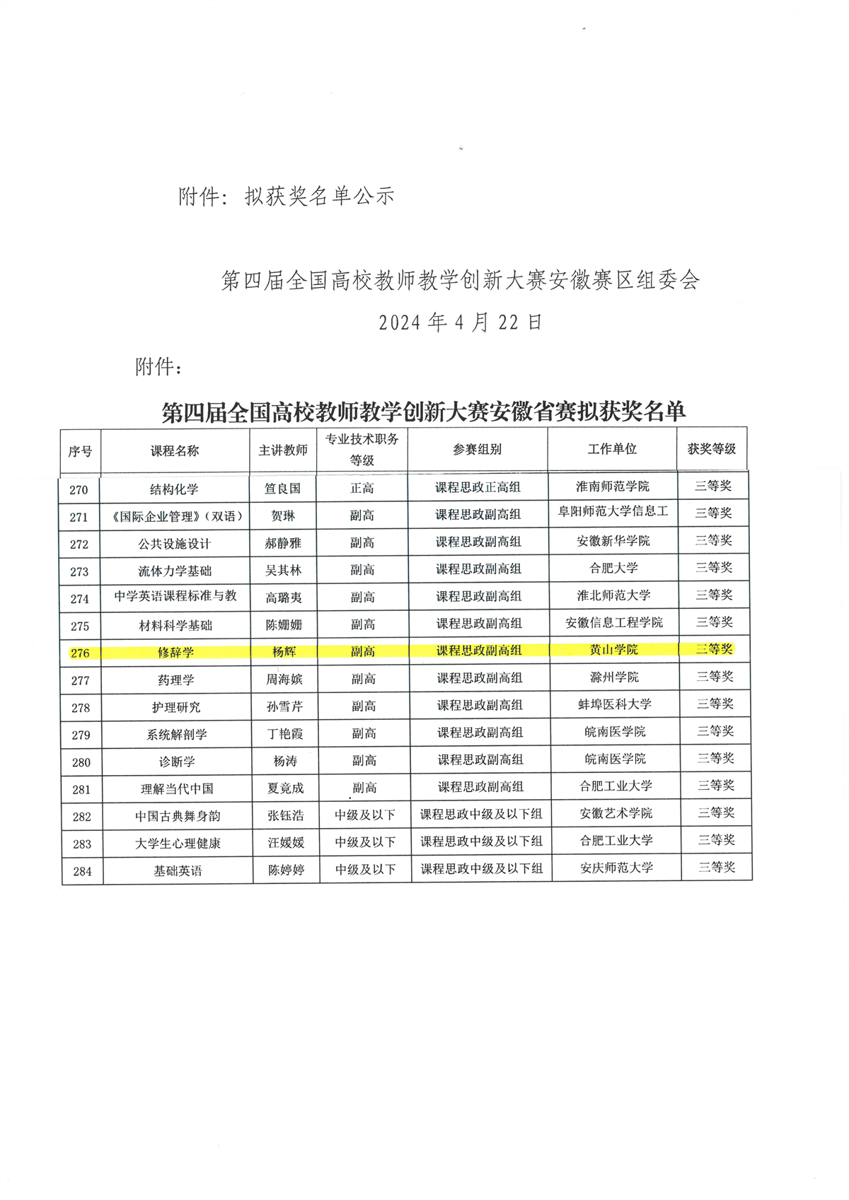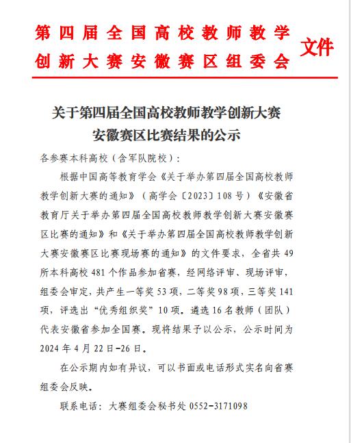 据安徽省高等学校教师教学发展联盟《关于第四届全国高校教师教学创新大赛安徽赛区比赛结果的公示》文件,太阳集团tyc151cc杨辉老师《修辞学》教学团队荣获课程思政副高组三等奖。本次大赛由安徽省教育厅主办,安徽财经大学承办,以“推动教学创新、培养一流人才”为主题,共设置新工科、新医科、新农科、新文科、基础课程6个组别。大赛分为网络评审和现场评审两个环节,全省49所本科高校481个作品参加省赛。