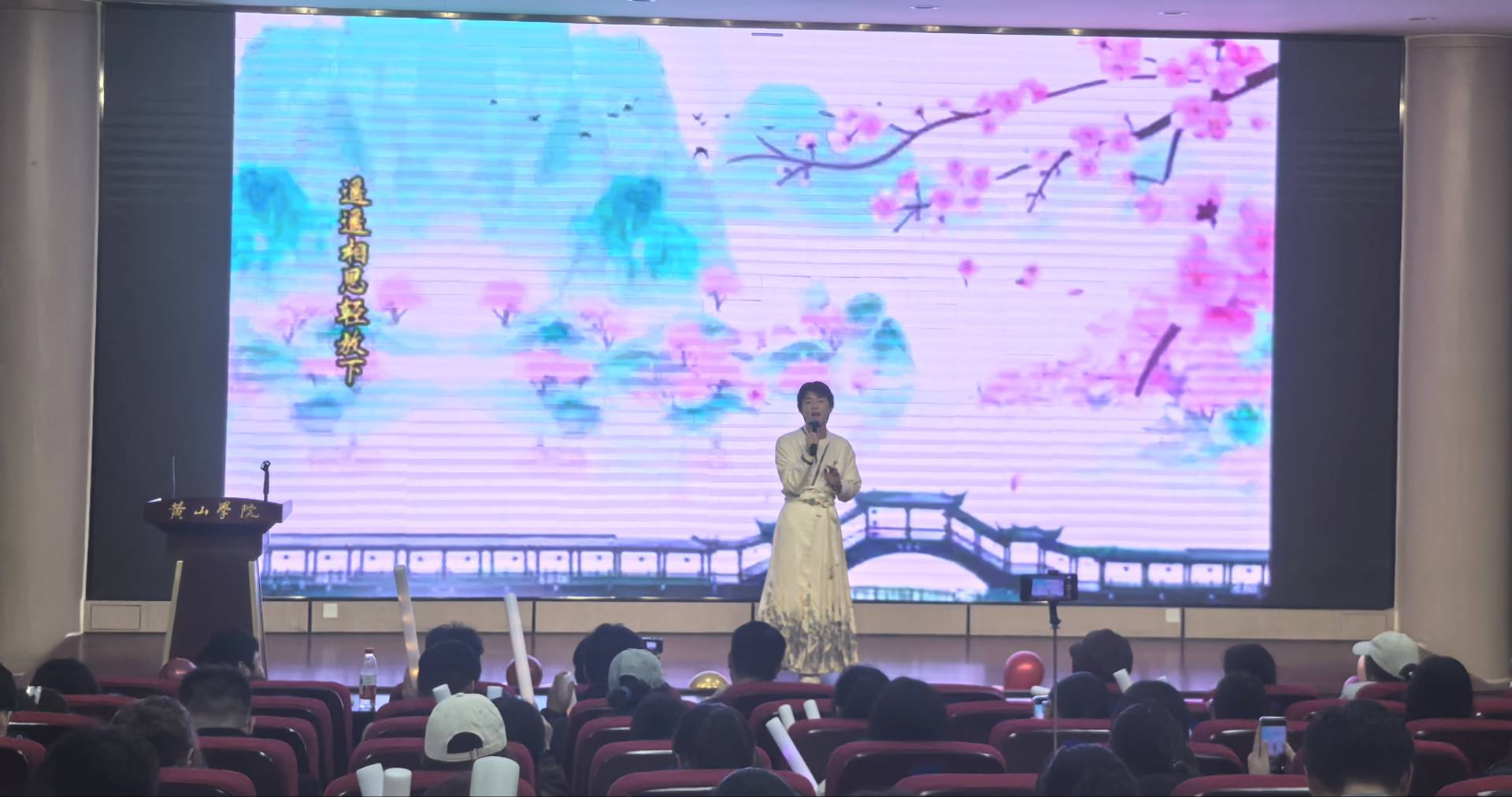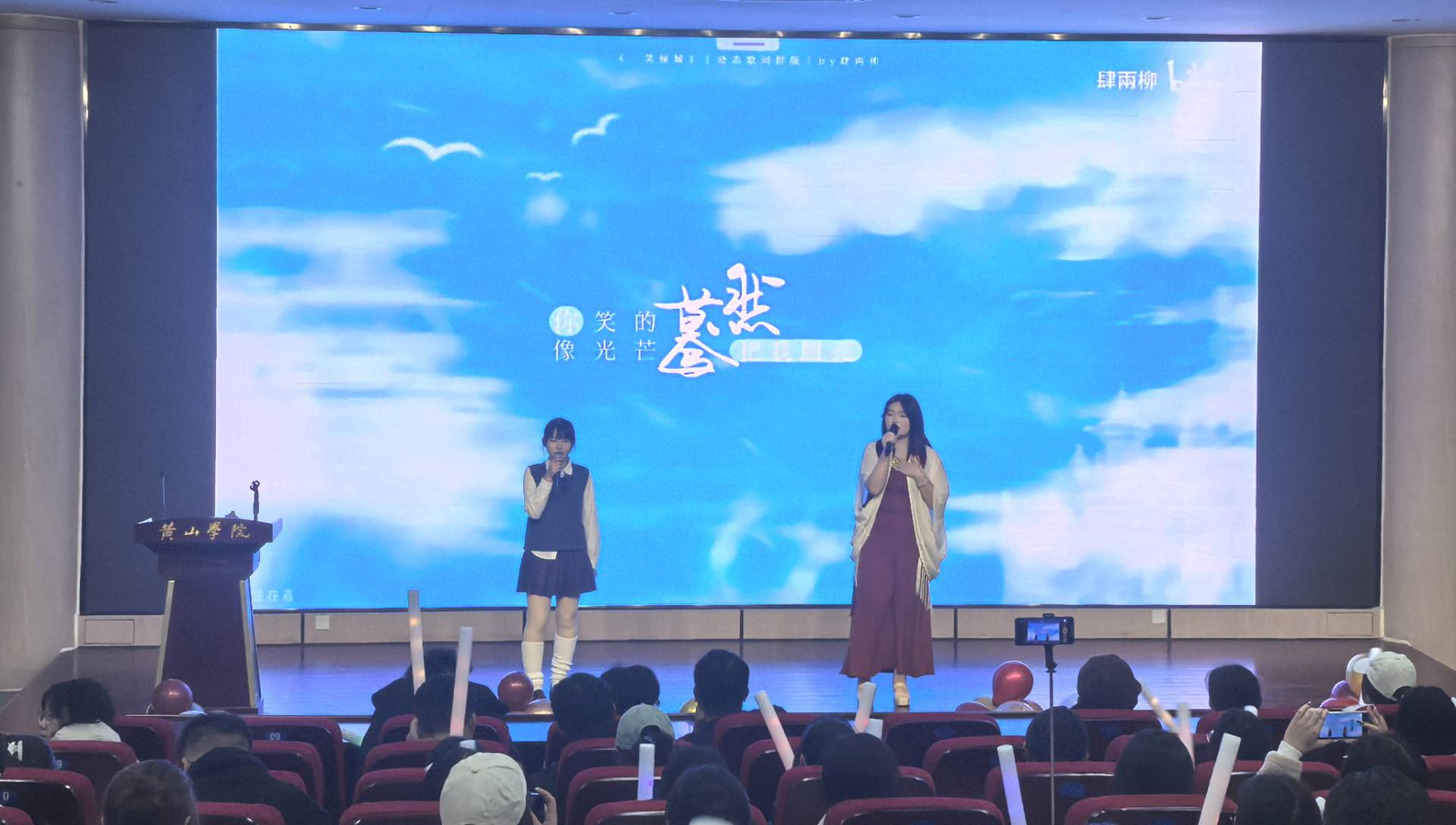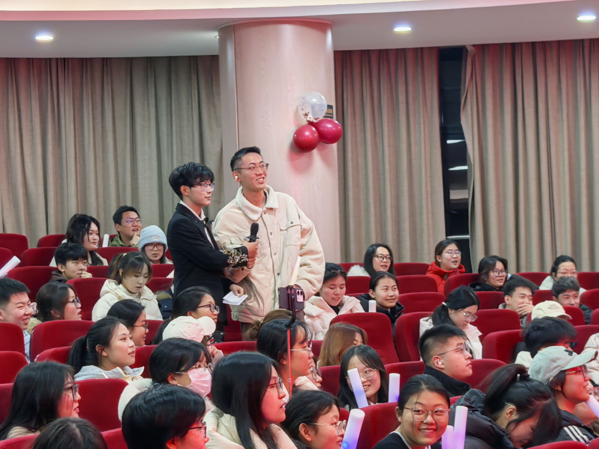 晚会在活力舞蹈《喜羊羊与灰太狼》中拉开帷幕,灵动的舞步、欢快的节奏瞬间点燃现场气氛。随后,歌曲演奏《红色高跟鞋》旋律悠扬,双人对唱《一笑倾城》甜蜜温馨,歌曲演唱《相思遥》意境悠远,还有活力舞蹈串烧动感十足,乐器演奏《梨花雨》古韵悠扬,众多节目轮番上演,赢得台下阵阵掌声。互动环节“猜歌”与“有奖问答”趣味十足,台下观众踊跃举手、积极参与,欢呼声与笑声此起彼伏,将晚会氛围推向高潮。汉服走秀《云尚拂月,汉韵流光》中,各个演员身着精美汉服款款而来,尽显传统服饰之美;朗诵节目《那一年,中国青年正十八》情感真挚,传递出青年一代的热血与担当。最后,晚会在歌曲《My LOVE》的悠扬旋律中圆满落幕。