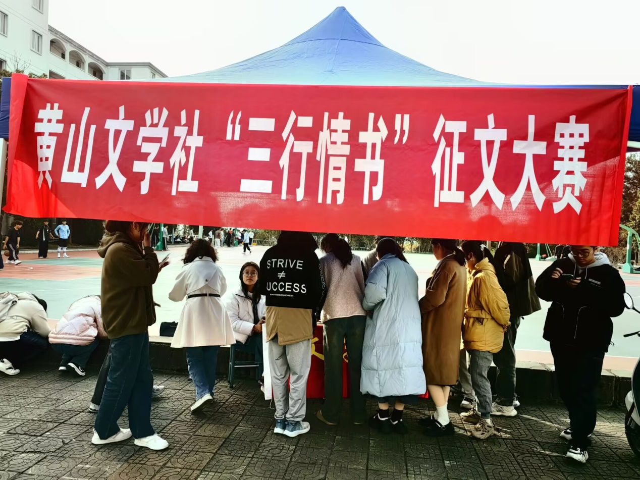 为丰富同学课余生活,展现当代大学生积极乐观的生活态度。2023年12月2日,黄山文学社开展了“三行情书”征文比赛活动,活动参与人数约500人。