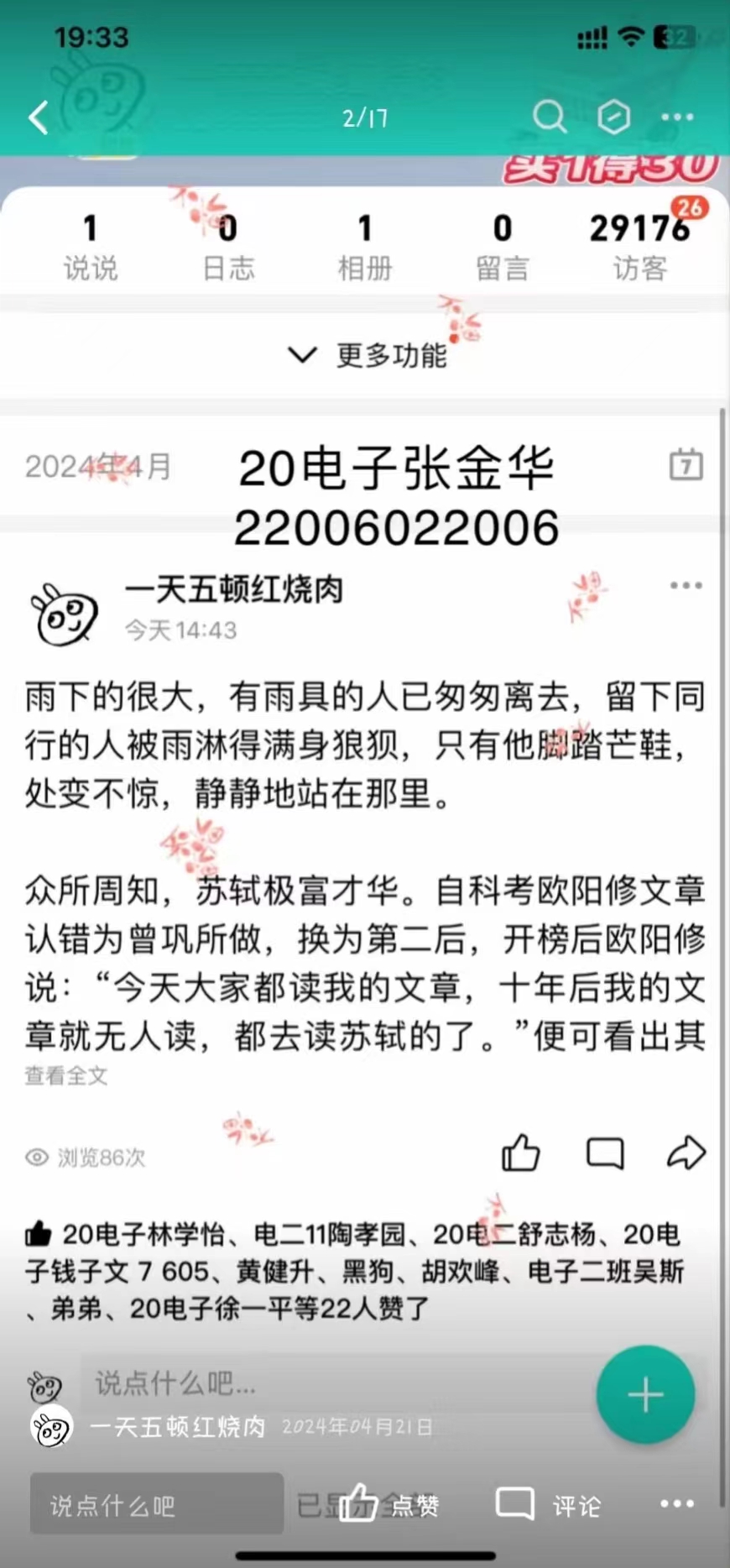 在活动期间,参与人员在活动开始之后,选择一位自己喜欢的文人,编辑文案后在自己的QQ空间发布说说,注意说说内容需要介绍历史上的一位名人,最少200字,并集满至少20个赞。参与者在活动结束前将说说的截图上传至活动群相册,截图上备注班级姓名学号。