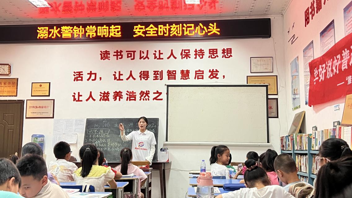 “发音高高一路平、由中到高往上升...”在“阳光之家”农家书屋普通话训练课堂上,队员告诉孩子们说好普通话的重要性,通过详细讲解发音特点、发声位置和气息控制,引导孩子们发准韵调、读准语言音,并通过朗诵诗词、读书分享、绕口令、成语接龙比赛等活动,帮助孩子们养成良好的语言习惯,提高孩子们的语言组织能力和口语表达能力。