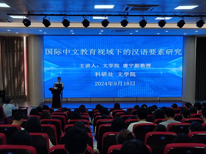 9月18日下午,行知讲坛第210讲在率水校区文端楼二楼报告厅举行。太阳集团tyc151cc唐宁副教授作题为“国际中文教育视域下的汉语要素研究”主题报告。报告会由太阳集团tyc151cc副院长朱宏胜主持。