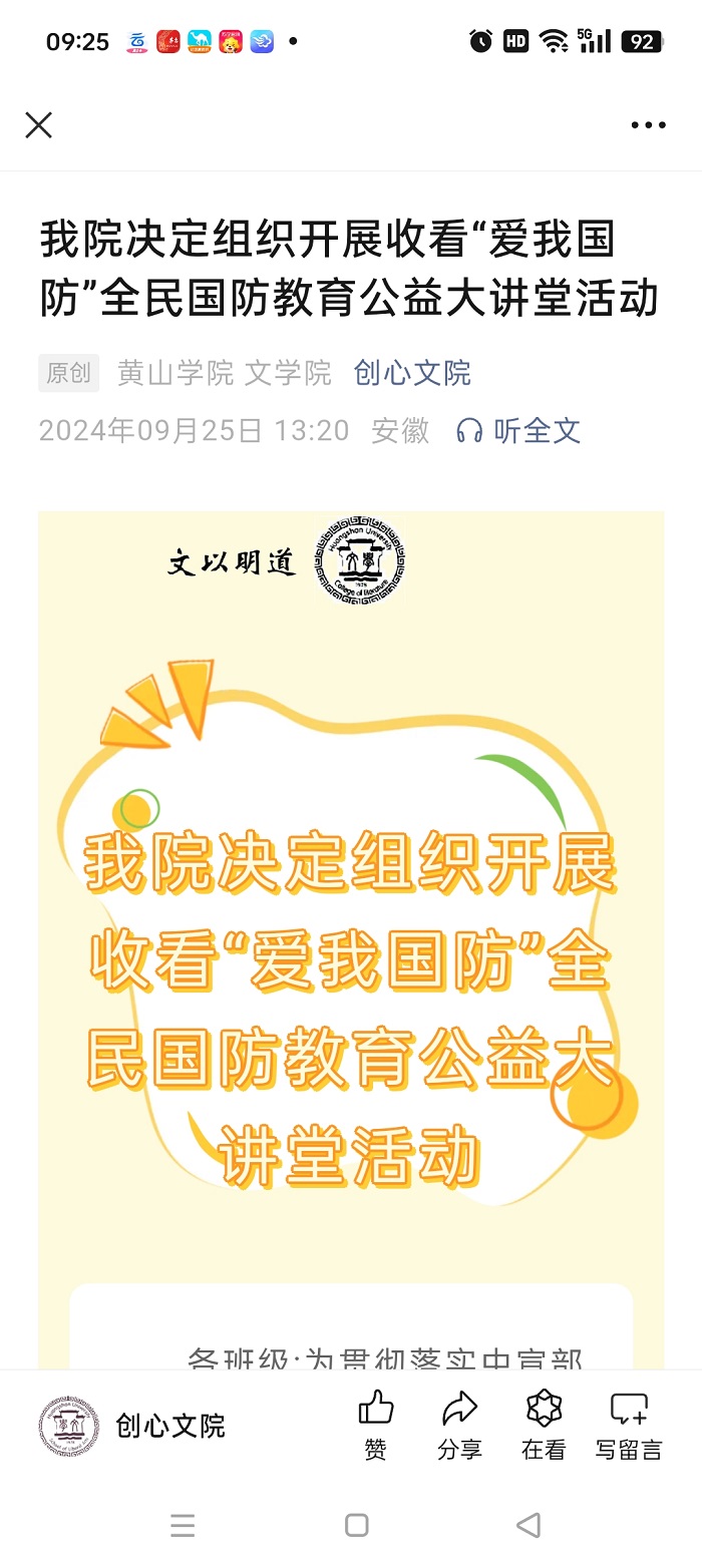 此外,我院还在学院公众号“创心文院”上积极宣传“爱我国防”全民国防教育公益大讲堂活动,营造关心国防、热爱国防、建设国防、保卫国防的浓厚氛围。