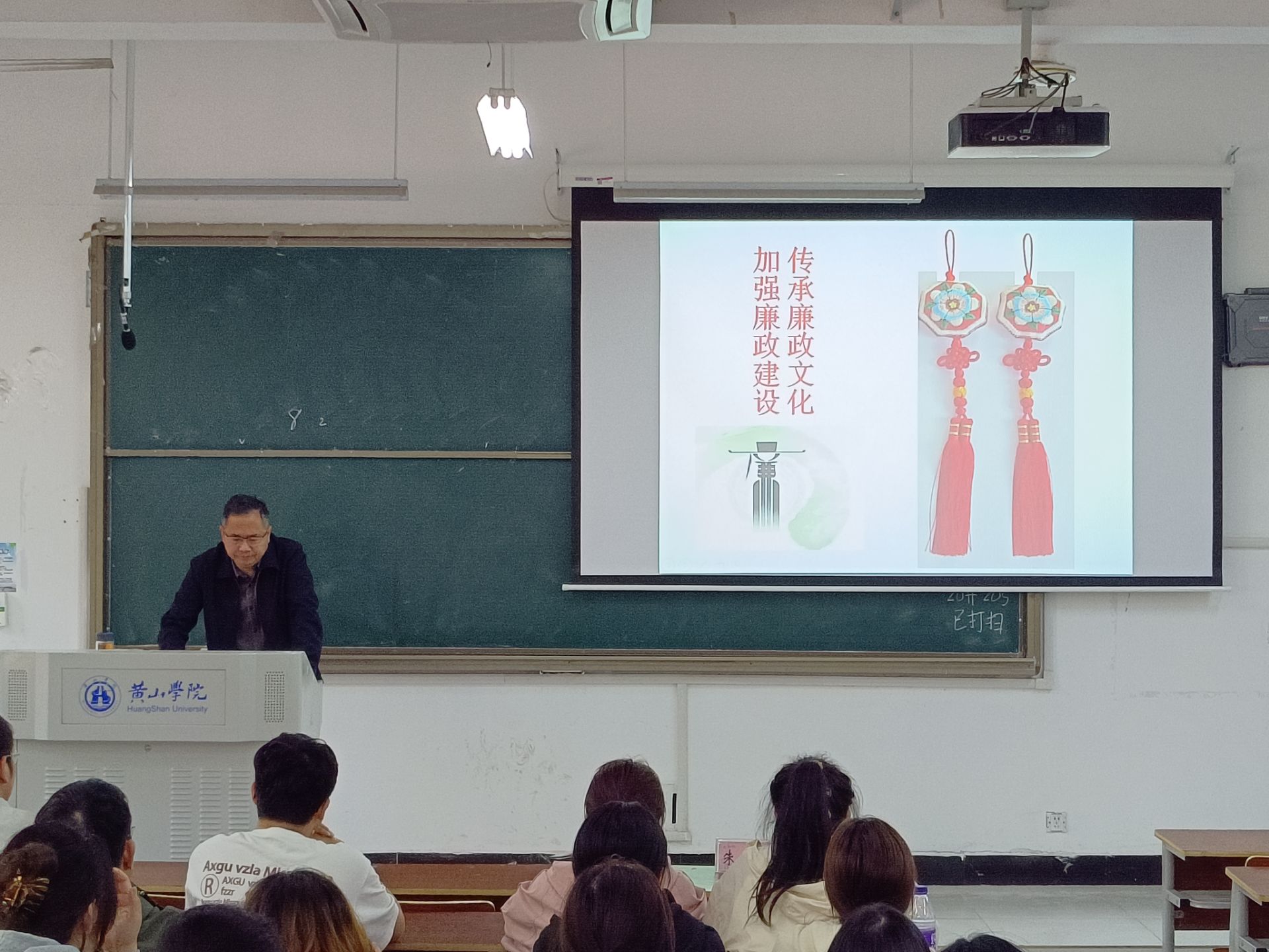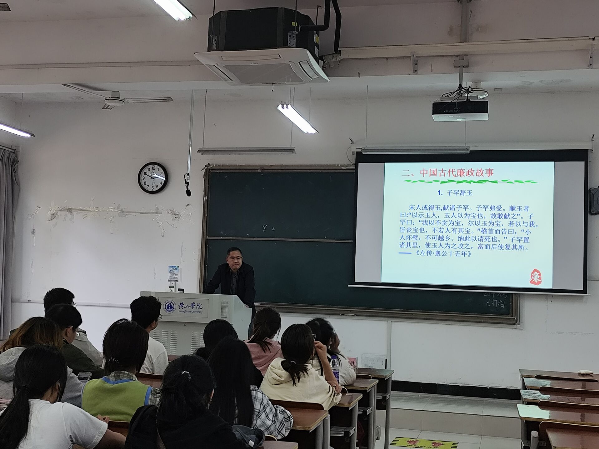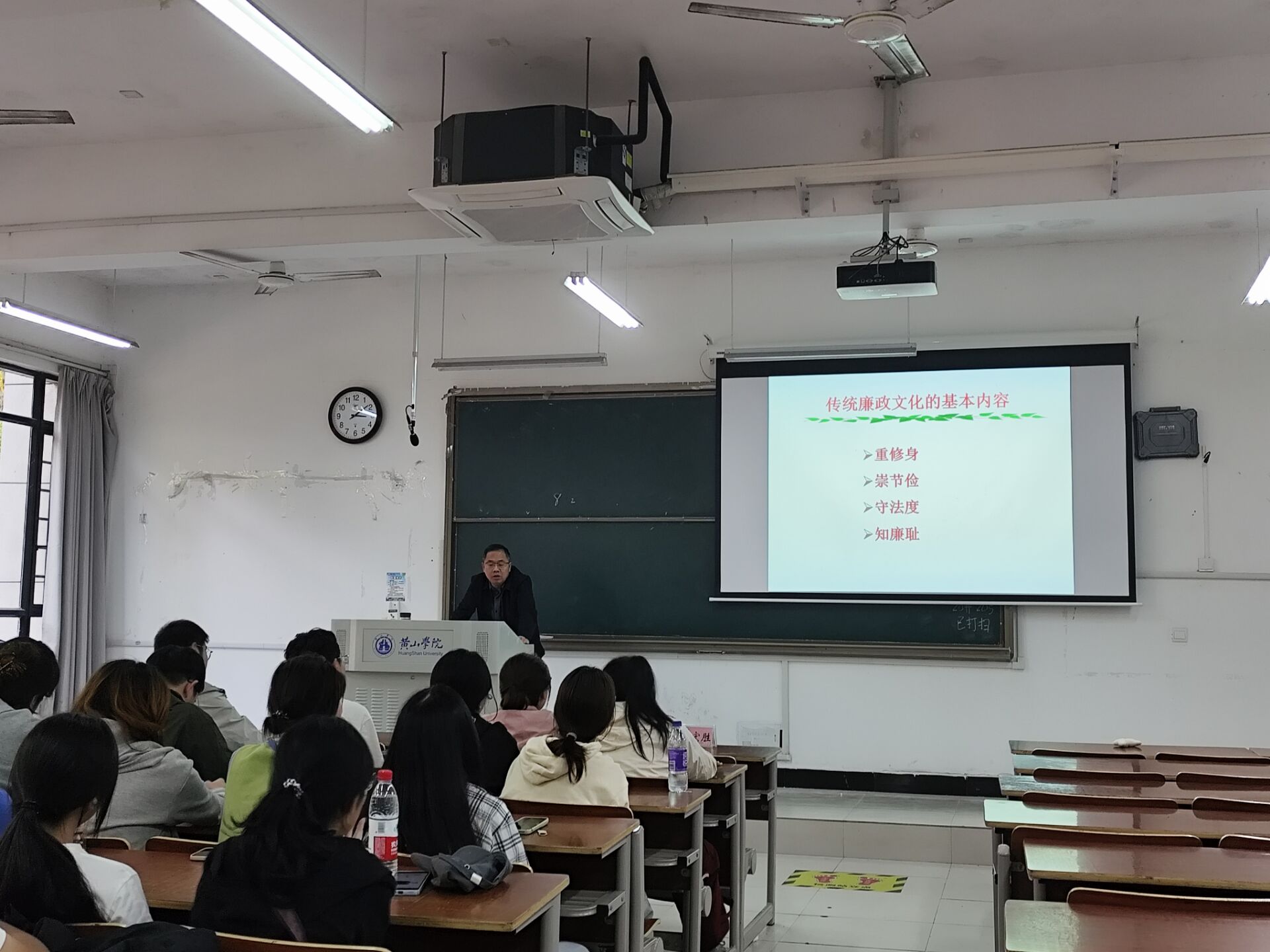 朱宏胜以“传承廉洁文化、加强廉政建设”为题,以中国古代廉政诗词和廉政故事为载体,展开了一堂别开生面的廉政专题讲座。从战国屈原《招魂》、宋朝包拯《手端州郡斋壁》、明代况中《拒礼诗》、《离任》等廉洁诗词入手,带领全体学生干部从古诗词中的清廉文化和美好高洁、以史为鉴加强廉政建设等方面生动有趣地解读了古代的廉洁思想,同时向同学讲述了《子罕辞玉》、《杨震拒金》、《一钱太守》、《陶母退鱼》等经典廉政故事,并诠释了中华廉政文化的精神内涵与特征。此次专题讲座不仅阐述了古代廉洁文化的精神内涵,而且教育引导全院学生干部树清风、扬正气,努力营造崇廉尚洁、风清气正的校园氛围。