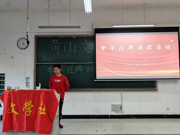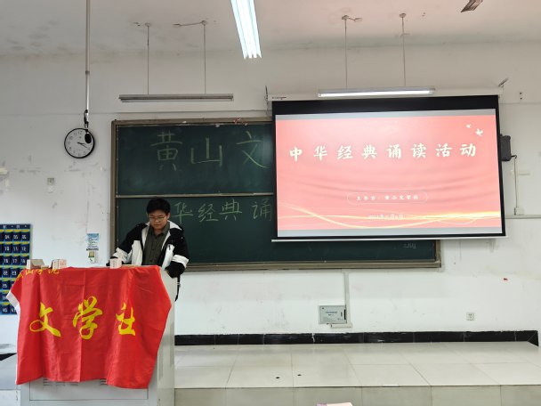 为引领广大青年深入学习和宣传贯彻党的二十届三中全会精神,更好地传承和弘扬中华优秀传统文化,并在广大学生中培育和践行社会主义核心价值观,展现我校学生健康向上、朝气蓬勃的精神风貌,2024年11月6日,由黄山文学社举办的“古韵流芳,经典传唱”中华经典诵读活动在文端楼2207圆满完成。