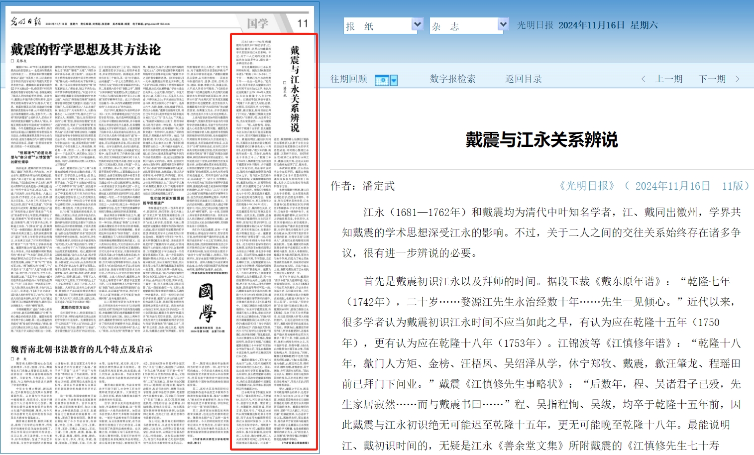11月16日,我院潘定武教授在《光明日报》国学版发表学术文章《戴震与江永关系辨说》。这是潘定武教授于戴震诞辰三百周年前后在《光明日报》发表的第二篇论文。