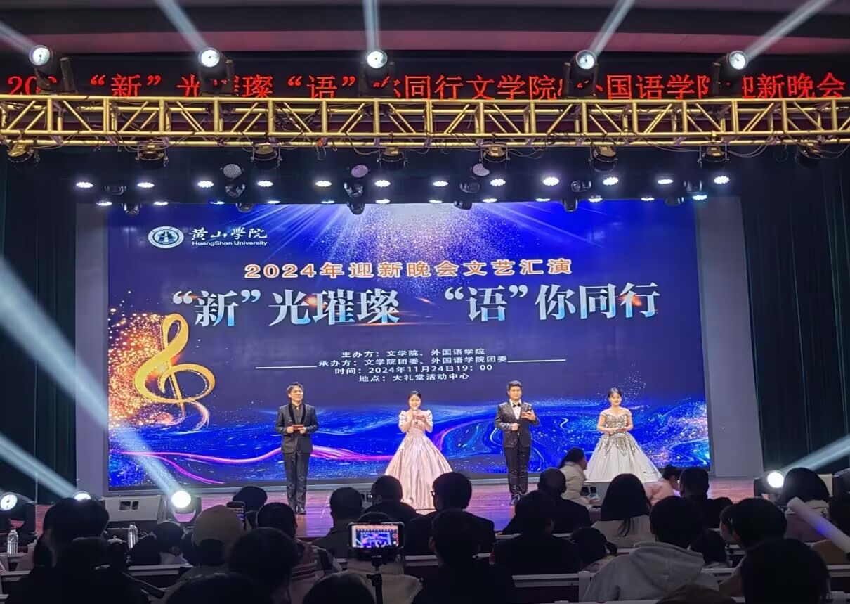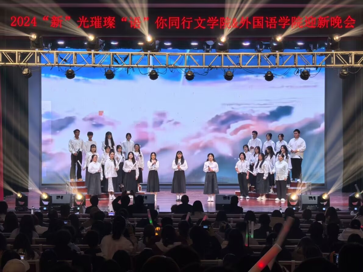 11月24日晚, 由太阳集团tyc151cc与外国语学院联合主办的“新”光璀璨,“语”你同行2024年迎新晚会在大学生活动中心举办,外国语学院党委书记乔根、太阳集团tyc151cc院长沈昌明、外国语学院院长洪常春、太阳集团tyc151cc党总支副书记周志荣到场观看了本次晚会。