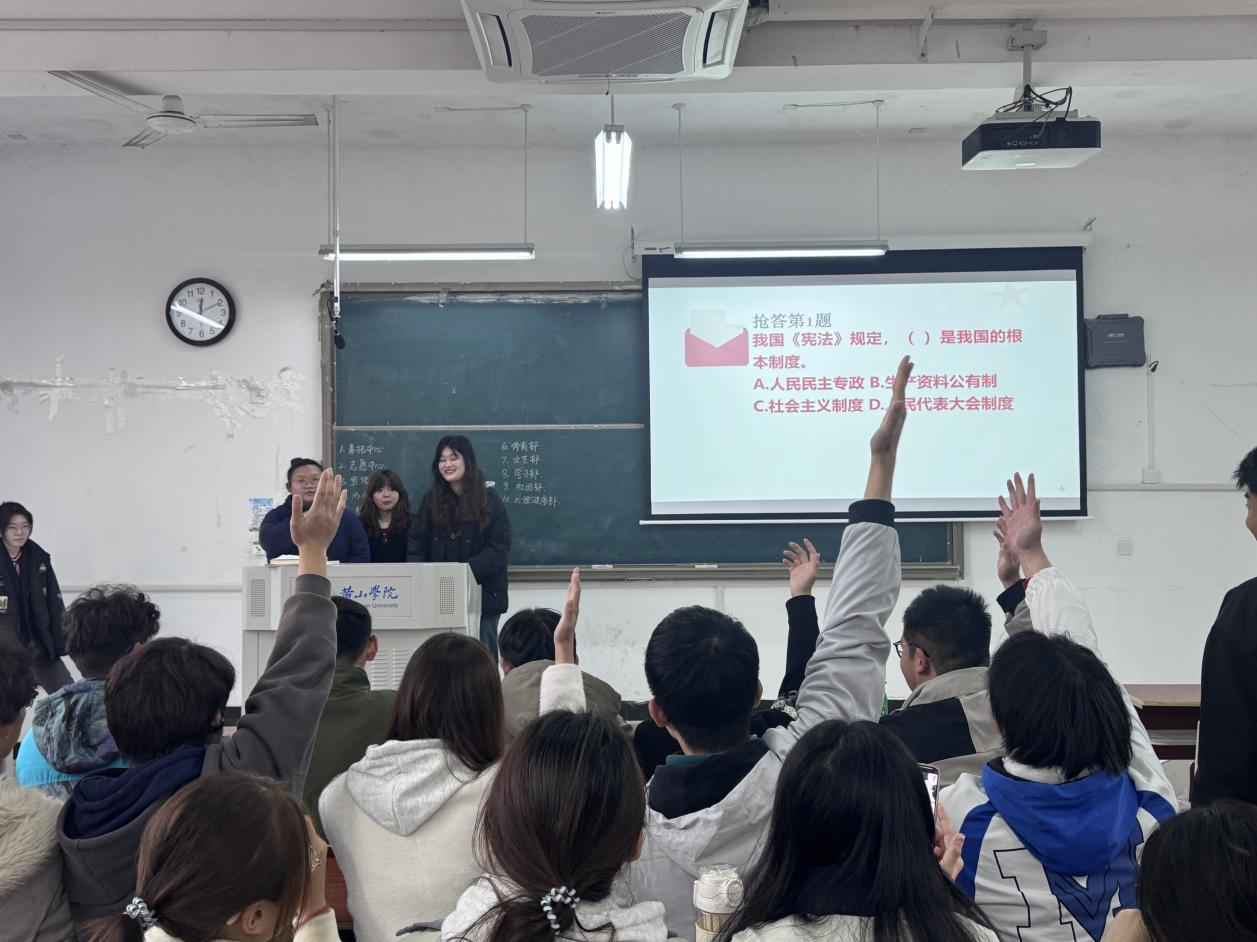 本次比赛以学生会各部门为单位进行小组PK,分为必答题和抢答题两个环节,题型包括单选、多选、判断等,试题涉及《中华人民共和国宪法》和《《中华人民共和国民法典》》相关内容。经过各部门选手的激烈角逐,最后组织部和素拓中心两个部门选手凭借丰富的法律知识储备脱颖而出,荣获本届“学宪法,讲宪法”知识竞赛一等奖。