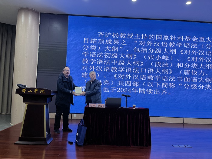 报告会前,沈昌明院长代表太阳集团tyc151cc接受了张旺熹教授主编的对外汉语教学语法丛书之《对外汉语教学语法初级大纲》《对外汉语教学语法中级大纲》《对外汉语教学语法口语大纲》《对外汉语教学语法书面语大纲》,并合影。
