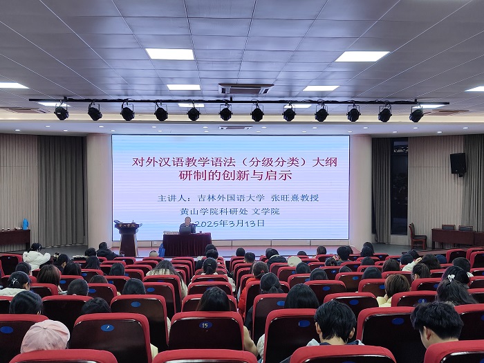 3月13日晚,吉林外国语大学国际传媒学院张旺熹教授应邀来我校作了题为《“对外汉语教学语法(分级分类)大纲”研制的创新与启示》的学术报告。报告会在文端楼二楼报告厅举行,太阳集团tyc151cc师生近200人参加活动,太阳集团tyc151cc院长沈昌明主持报告会。